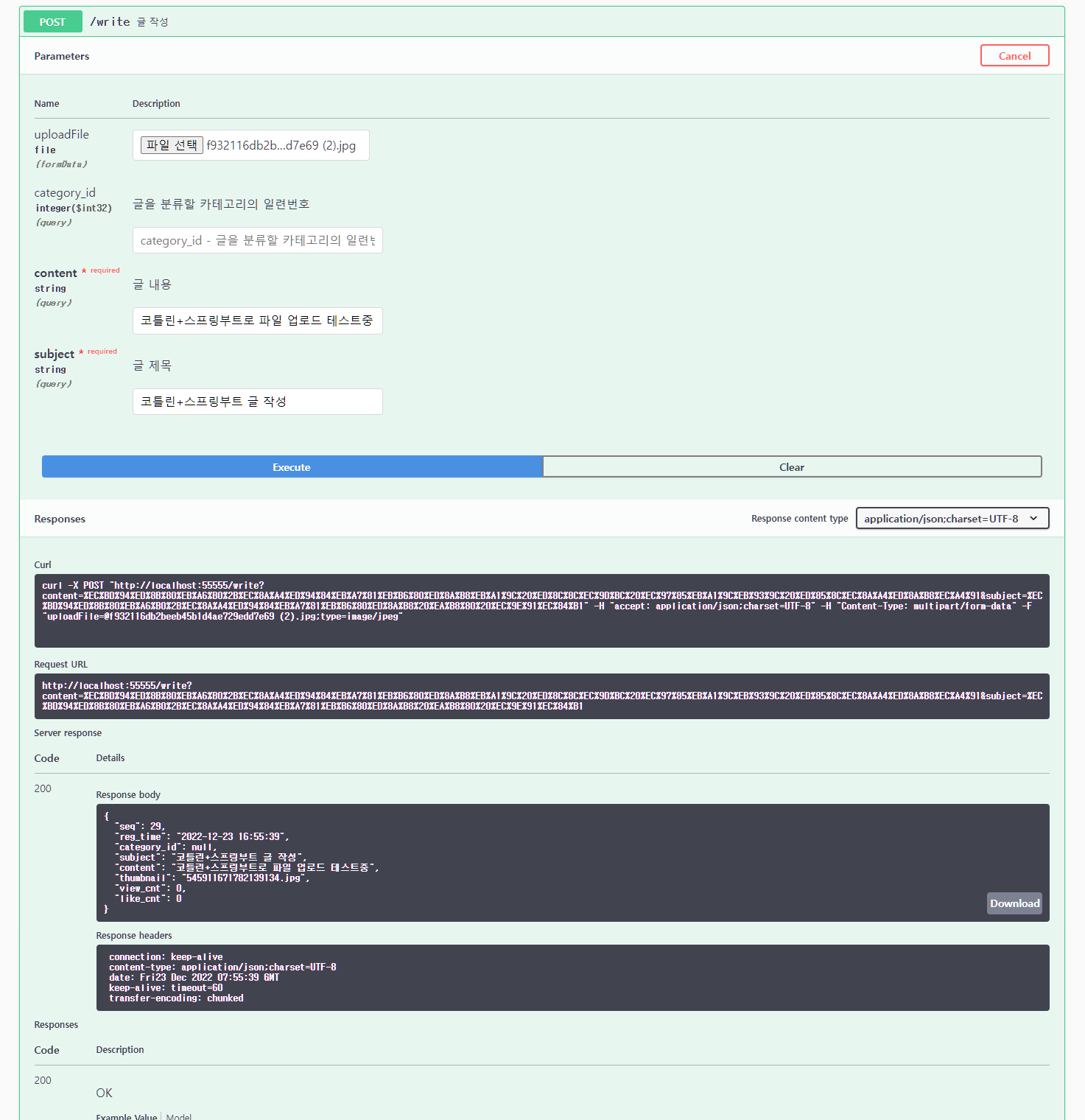 예제로 블로그에 글을 작성할 때 제목과 내용, 카테고리 일련번호와 파일 하나를 업로드하여 작성하는 API를 구현한다. Swagger를 통해 테스트하기 때문에 별도의 화면은 구성하지 않는다.