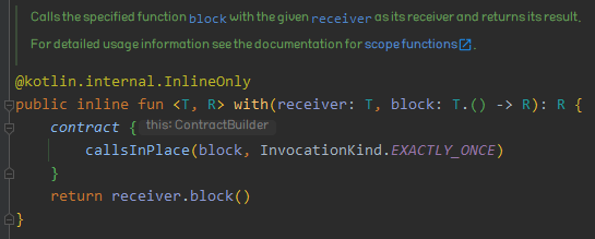 with는 다른 스코프 함수와는 달리 확장 함수가 아닌 일반 함수이다. 어떤 객체 receiver를 파라미터로 받고, receiver에 대한 확장 함수를 파라미터로 받아서 block 내부의 동작을 수행하고 해당 함수의 반환값을 반환하게 된다. with가 다른 스코프 함수와 갖는 가장 큰 차이점은 객체를 파라미터로 받는 일반 함수이기 때문에 해당 receiver는 반드시 non-null이라는 것을 보장해줘야 정상적으로 작동하게 된다. 다른 4 종류의 스코프 함수는 확장 함수이기 때문에 safe call(.?)이 가능하고 elvis 연산자(?:)를 통해 해당 객체가 null일 경우에 대한 동작을 지정할 수 있지만 with는 이러한 null 검사가 불가능하다.