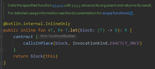 let은 파라미터로 받는 block이라는 함수가 원본 객체를 파라미터로 받는 일반 함수이며, 해당 함수의 동작을 수행한 후 함수의 반환값을 반환한다. 파라미터로 접근하기 위해선 기본적으로 it을 사용하지만 다른 람다 함수와 마찬가지로 이 이름은 변경할 수 있다. 다음 예시 코드는 let을 사용하는 대표적인 예시이다.