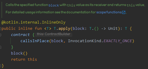 apply는 파라미터로 받는 block이라는 함수가 원본 객체의 확장 함수이며, block 내부의 동작을 수행한 후 원본 객체를 반환한다. apply도 run과 마찬가지로 원본 객체의 멤버에 접근하기 위해서는 기본적으로 this 키워드를 사용해야하지만 원본 객체의 멤버에 접근할 때 this를 생략할 수 있다. 위 also의 경우를 apply를 사용하면 다음과 같이 표현된다.