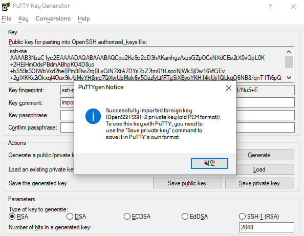 알림창이 뜨면 확인을 누르고 Save private key를 눌러 키 파일을 저장한다. 경고창은 무시해도 된다.