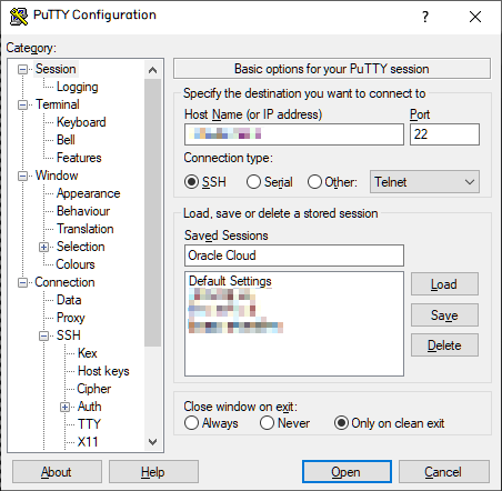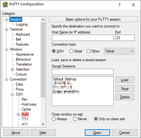 putty를 실행하면 다음과 같은 설정창이 나타난다.