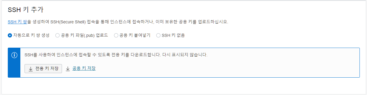 인스턴스에 원격으로 접속하기 위한 인증키를 설정한다. 별도의 인증키가 없다면 자동으로 키 쌍 생성을 선택하고 전용 키와 공용 키를 저장해둔다. 자동으로 키 쌍 생성을 선택하고 키를 저장해두지 않으면 복구가 불가능하니 주의하자.