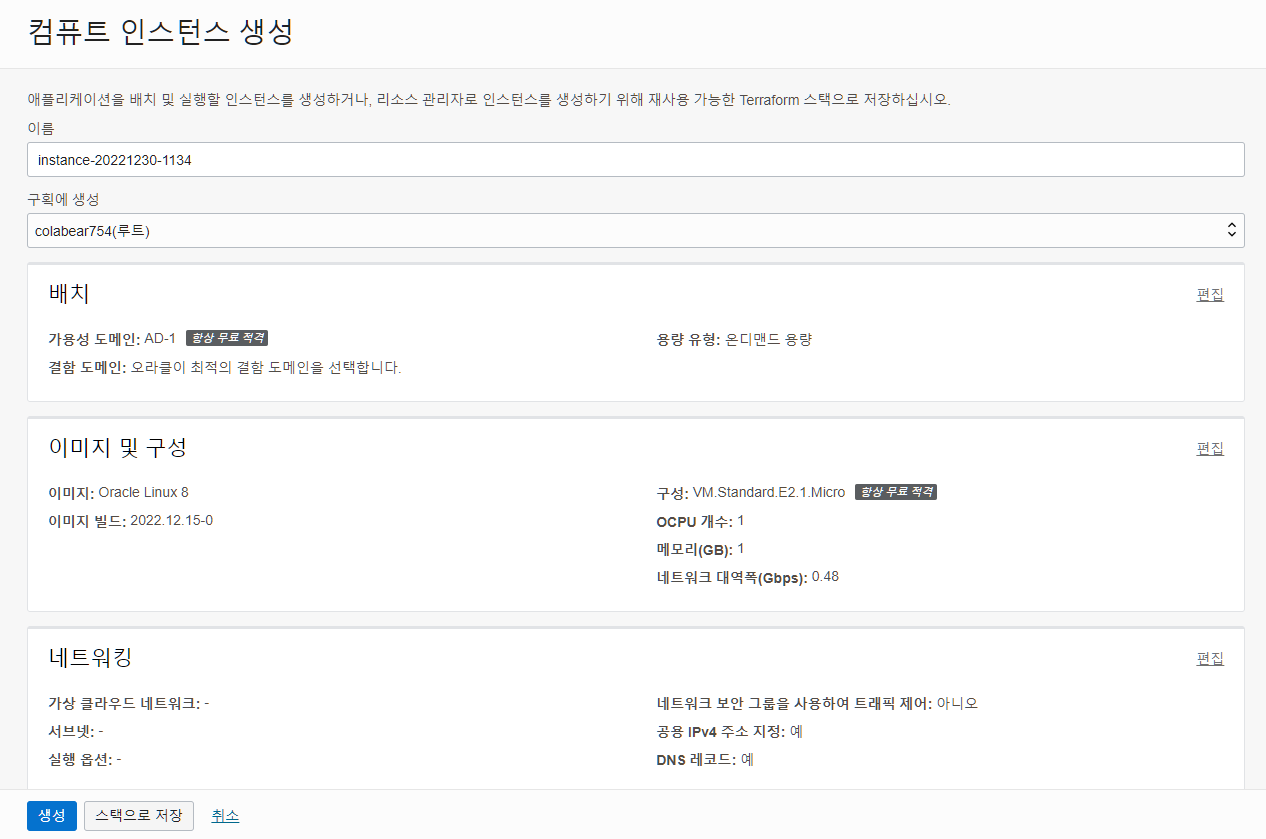 설정이 끝났다면 생성 버튼을 눌러 인스턴스를 생성한다.