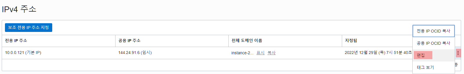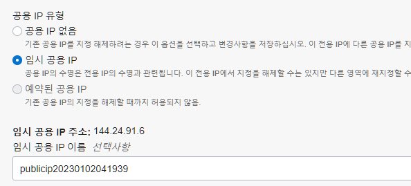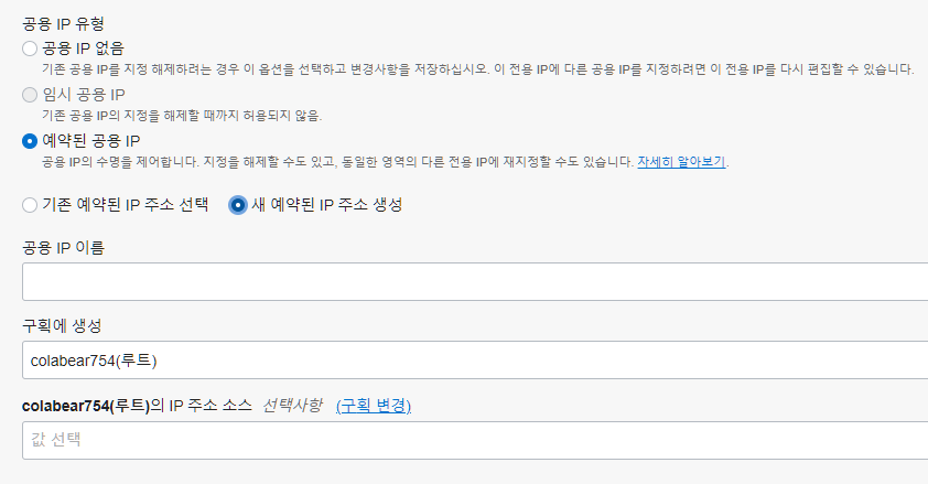기본적으로 이와 같이 설정되어 있을텐데 '공용 IP 없음'으로 변경한 후, 다시 편집에 들어가서 '예약된 공용 IP'를 선택한다.