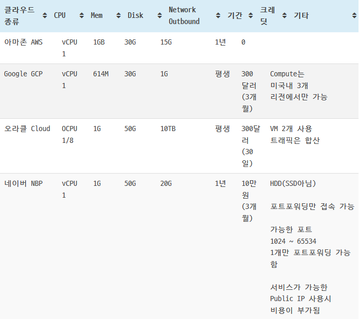 여러 클라우드 컴퓨팅 서비스 중에 오라클 클라우드를 선택하게 된 이유는 조건들이 대체로 좋은 편이었고, 무엇보다 평생 무료로 사용할 수 있다는 점이 컸다. AWS나 NBP는 무료 사용 기간이 1년으로 제한되어 있고, GCP는 조건이 오라클 클라우드에 비해 떨어진다고 생각되었다.