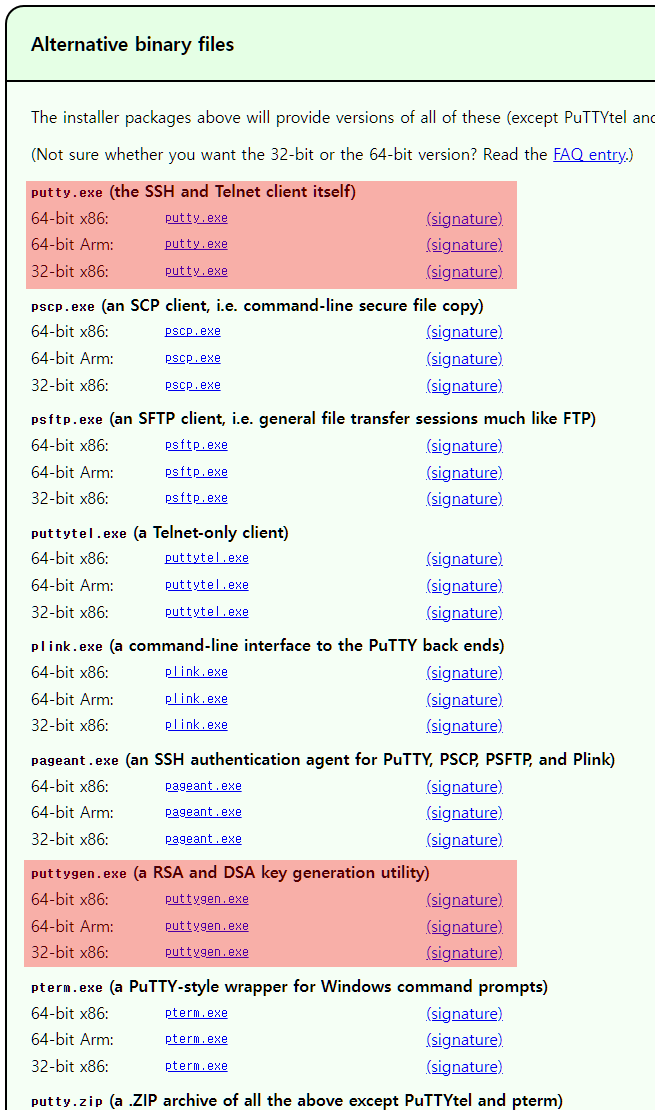 필자는 외부 리눅스에 접속할 때 putty라는 프로그램을 사용하는 것이 익숙하다보니 본 포스트에서는 putty를 사용하여 인스턴스에 원격 접속을 할 것이다. 이를 위해선 앞서 인스턴스를 생성할 때 저장했던 키 파일과 puttygen이라는 프로그램이 필요하다. 해당 프로그램들은 아래 링크에서 다운받을 수 있다.