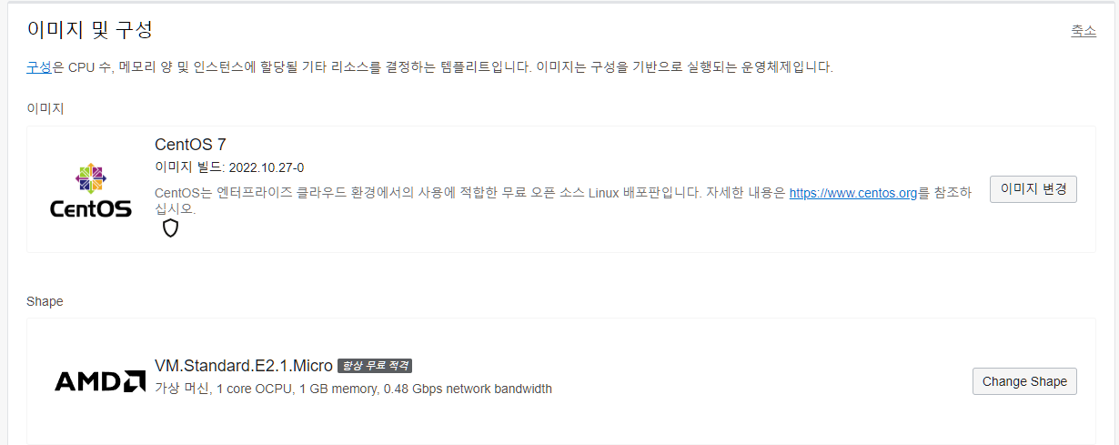 이미지는 기본값으로 Oracle Linux가 설정되어 있는데, 필자는 CentOS를 선택했다. Shape는 따로 설정할 필요는 없다.