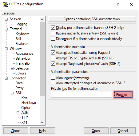 Browse...버튼을 눌러 puttygen으로 생성한 ppk 파일을 선택한다.
