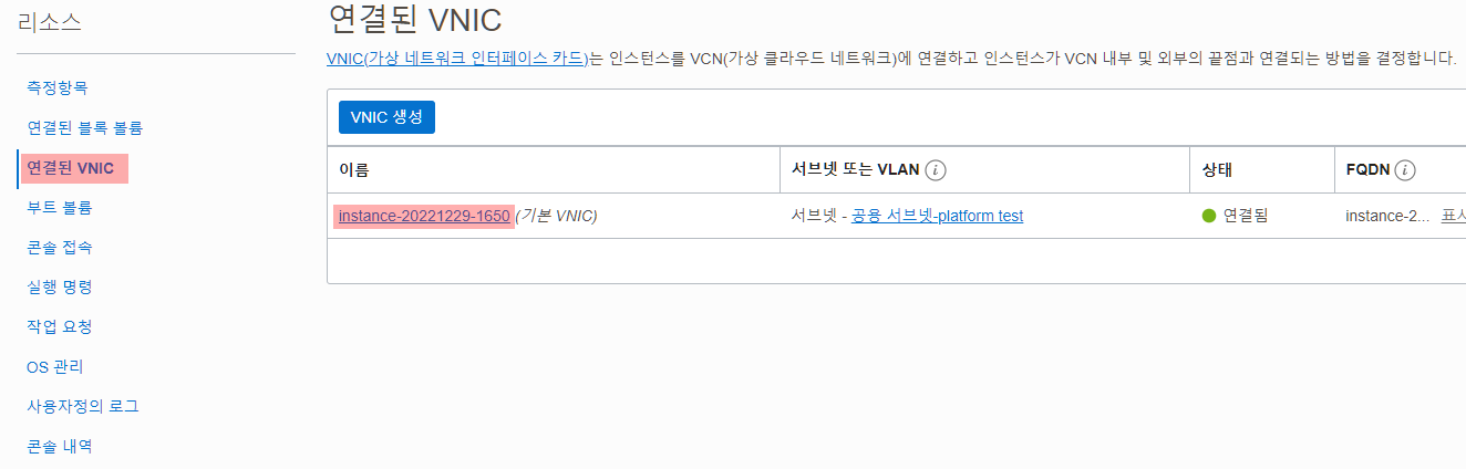 인스턴스 정보 페이지에서 아래로 스크롤을 내리면 좌측에 리소스라는 메뉴가 있는데 '연결된 VNIC'를 클릭하고 '기본 VNIC'라고 적힌 인스턴스를 클릭한다.
