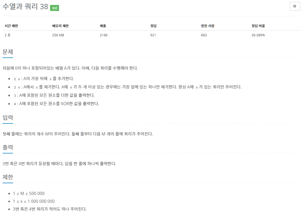수열, 배열이라는 말이 있어서 실제로 리스트를 만들어서 구현하려고 할 수 있는데 함정이 있다. 쿼리의 개수가 최대 50만개이기 떄문에 실제 리스트에 25만개의 요소를 추가하고, 합이나 XOR 결과를 25만번 출력하게 되면 \(250,001\times250,000=62,500,250,000\)가 되어 약 625초의 시간이 걸리게 된다. 따라서, 실제 리스트를 구현하지 않고 답을 구해야 한다.