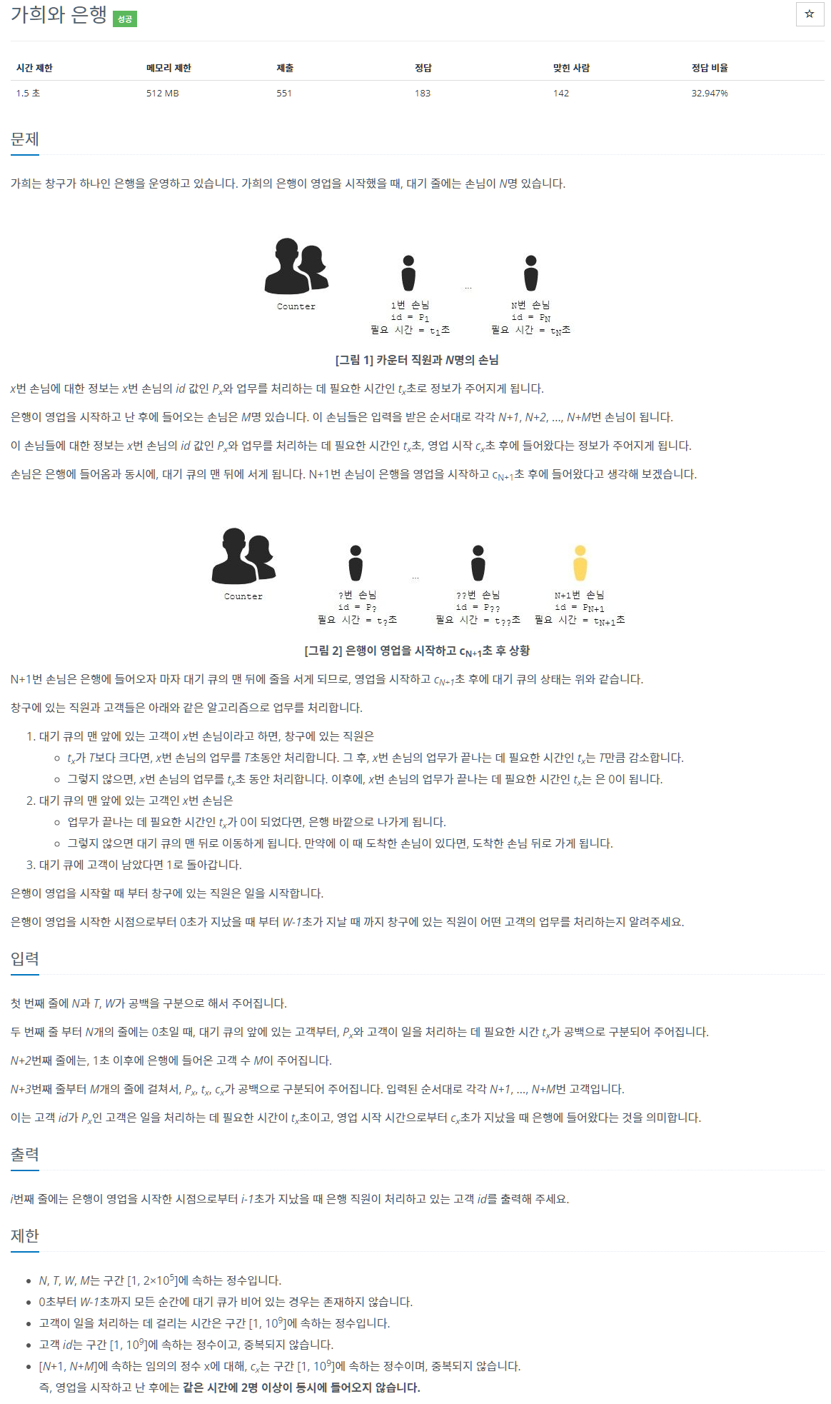 - 대기 큐에서 꺼낸 손님의 \(t_x\)가 \(T\)보다 크다면 \(\min(T,\) 현재 시간 \(- W)\) 개의 줄에 \(P_x\)를 출력한 후 \(t_x\)를 \(T\)만큼 감소시키고, 현재 시간을 \(T\)만큼 증가시킨다.