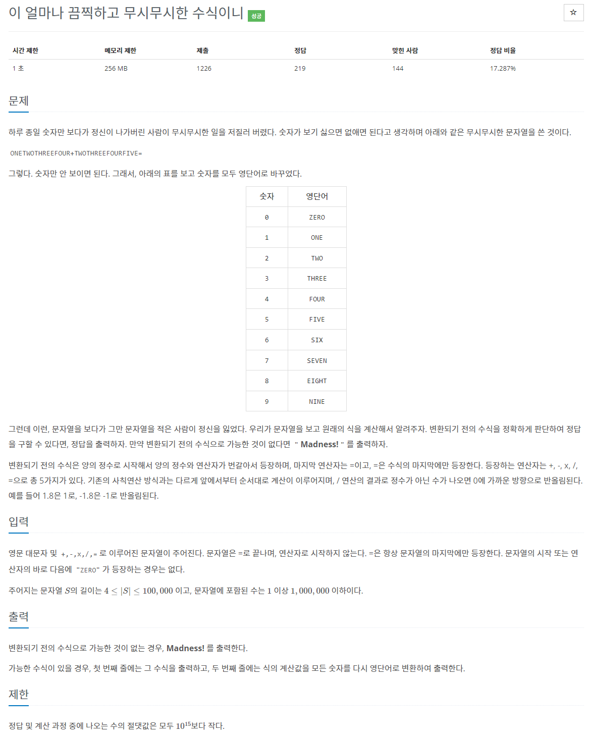 - 첫째 줄에 변환한 원래의 수식을, 둘째 줄에 계산 결과를 영단어로 변환한 문자열을 출력한다.