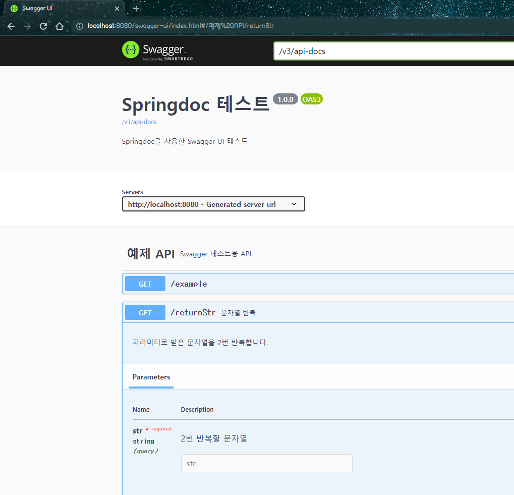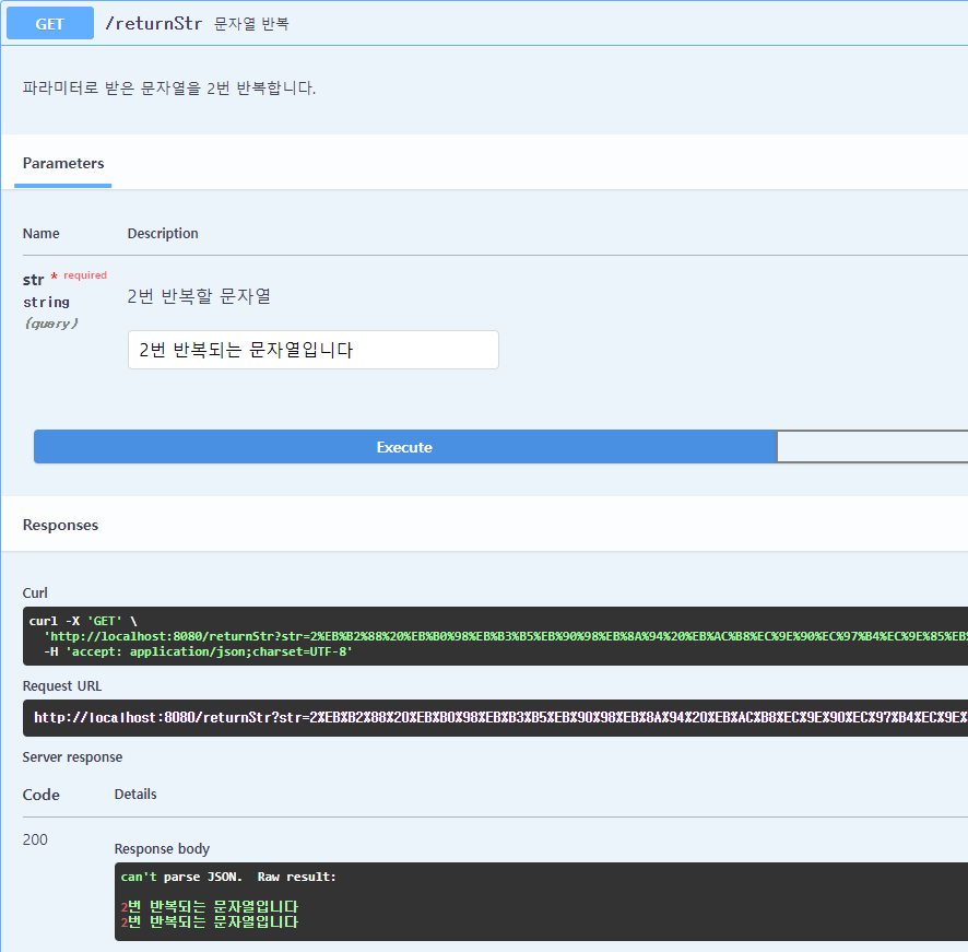 @Operation(summary = "문자열 반복", description = "파라미터로 받은 문자열을 2번 반복합니다.")