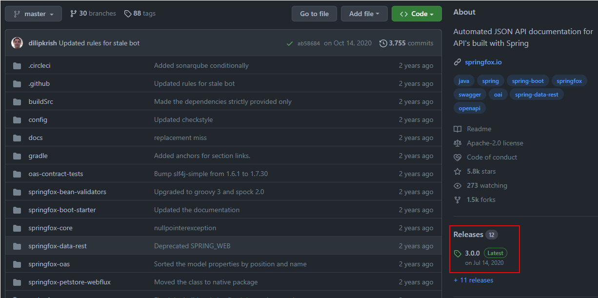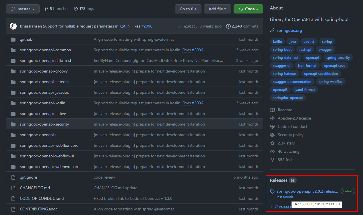 최근에는 Springdoc을 사용하는 것이 더 선호된다고 한다. Springfox의 경우에는 2020년 7월 이후로 업데이트가 중단된 반면, Springdoc은 최근까지도 지속적으로 업데이트중이기 때문이다. 따라서 이 포스트에서는 이전에 Springfox를 사용하여 작성한 Swagger 예제를 Springdoc으로 마이그레이션하는 내용을 주로 다룰 것이다.